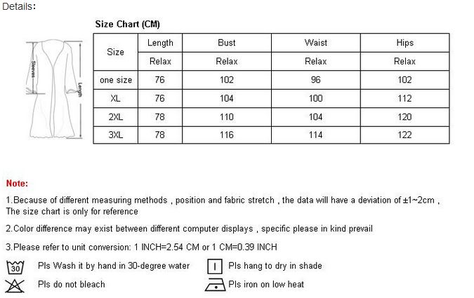 Charta saiz kami adalah ukuran standard untuk semua baju tidur saiz besar. Tetapi ia ada beza untuk sesetengah design. Untuk baju tidur yang ketat design, kami cadangkan anda pilih 1 saiz lebih besar daripada ukuran sebenar anda. Untuk baju tidur longgar design, anda boleh pilih mengikut ukuran sebenar anda. Walau bagaimanapun, ini ada tips kami daripada feedback customer kami. Anda boleh pilih mengikuti sukahati anda..